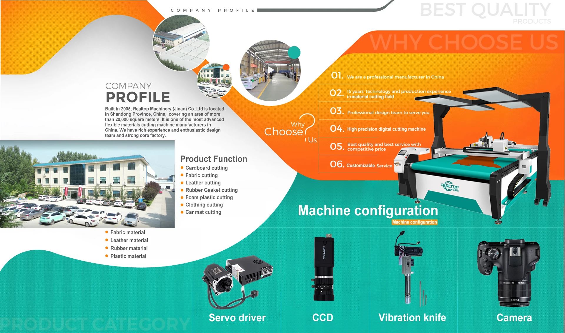 Built in 2005. Realtop Machinery (Jinan) Co..Ltd is located in Shandong Province. China. covering an area of more than 20.000 square meters. It is one of the most advanced flexible materials cutting machine manufacturers in China. We have rich experience and enthusiastic design team and strong core factory.As a high-tech enterprise specializing in R&D. production. sales and service of CNC cutting equipment. Realtop CNC Group Company has a group of top talents with rich experience in development and application. With more than 13 years experience. we are focus on digital cutting machines for leather. paper. stickers. foam. carpet and many other flexible materials cutting.RealTop CNC – Always your best solution provider for Cutting and Engraving CNC Machines. And Your visit to our factory is always highly welcomed here.