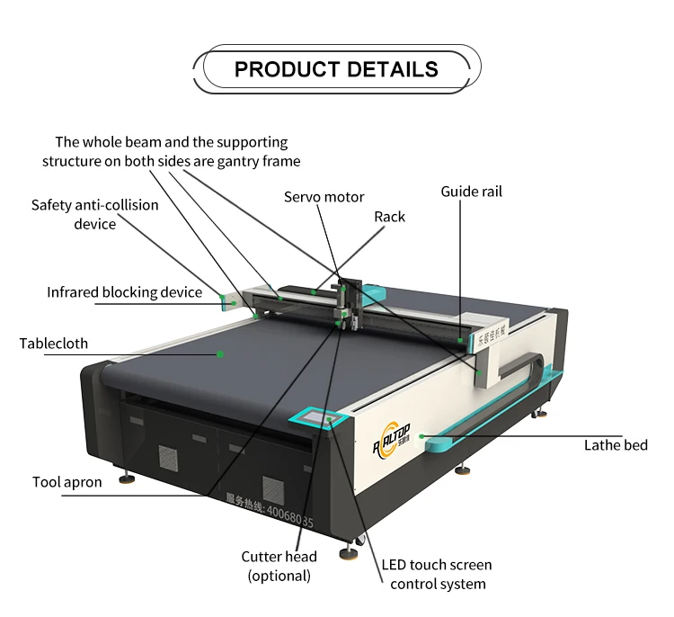 Please tell us what material you are cutting and the dimensions of the material (width and length). We will recommend a suitable model for you based on your material texture and size. If you can send us some trial cutting materials. we will record the cutting video for your reference. welcome to visit our company and factory if possible. 2: What materials can your machine cut? REALTOP digital cutting machine can cut different kinds of soft materials. Used in different industries such as shoes. bags. clothing. cartons. composite materials. automobiles. and home furnishings.3: How to use the machine? And what after-sales services can your company provide? If you purchase our machine. we will provide free installation and training. We provide one year free warranty at home and abroad. We provide machine manual and software manual instructions for each machine. as well as videos for your reference and 24-hour online technical support. All this support is free until you are fluent in operating the machine.4: What languages does the software system support? The menu is available in English. Russian. Italian. Chinese. etc. Special languages can be customized.5: How thick can your machine cut? Our machine can choose different types of cutting tool heads according to the thickness of your different materials to achieve cutting of various materials with different thicknesses. The cutting thickness of the machine is ≤100mm (varies with the material).6: This is my first time using this machine. Is it easy to operate? We will send you English manual and instruction video. which can teach you how to operate the machine. If you're still having trouble learning how to use it. we can chat by phone. email. or other contact method. Problems caused by incorrect operation will also be well solved.7: Can the machine be customized according to my requirements? Of course. we have a strong technical team and rich experi