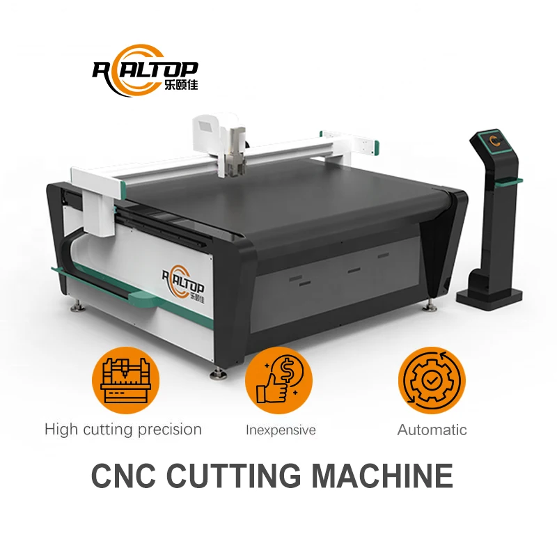 REALTOP CNC cutting machine uses a high-precision digital cutting system. which can realize full size cutting. kiss cutting. slot milling. punching. inkjet. drawing marking and other functions; the tool head has a full range of types: oscillating knife. pneumatic knife. high-power vibrating knife. circular knife . V cutting knife. drag knife. creasing wheel. dotted line knife. punching. brush. etc.; visual positioning includes: small CCD camera mark point positioning. panoramic camera recognition positioning. projection positioning. etc.The machine adopts blade physical cutting. the cutting section is straight and tidy. no burr. no air pollution. no burnt edge. no fluffy. no discoloration. and the cutting speed is 3-5 times faster than the laser cutting machine.The type of cutter can be adjusted to cut in different ways depending on the thickness of the material.