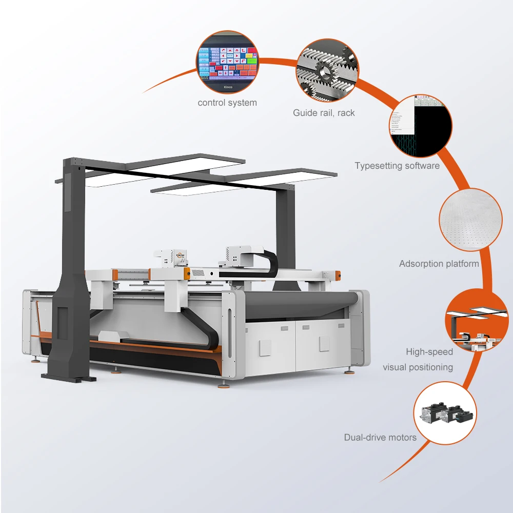 Enhancing Cutting Precision and Quality✳Performs high-precision contour recognition and positioning of printed materials (e.g.. printed fabrics. patterned rolls). reducing manual alignment errors and avoiding pressure marks.✳Edge Quality:Smooth. burr-free cuts requiring no secondary polishing. ensuring aesthetic and functional integrity for leather and fabric etc.Improving Production Efficiency and Reducing Costs✳Enables automated cutting. minimizing manual intervention and downtime; optimizes material usage through efficient nesting; pre-inspects and rejects defective materials to reduce waste.Mold-Free Flexible Production✳Eliminates mold development costs.✳One-click design switching via CAD files (supports DXF/PLT/AI formats). completing model changes in <1 minute.Intelligent Material Management✳Auto-Nesting System:Camera-based defect detection optimizes cutting paths. boosting material utilization by 15%–30%. reducing waste of premium leather/TPE.✳Integrates with production management systems for digital management and traceability; features power-off resume cutting to minimize unexpected losses.